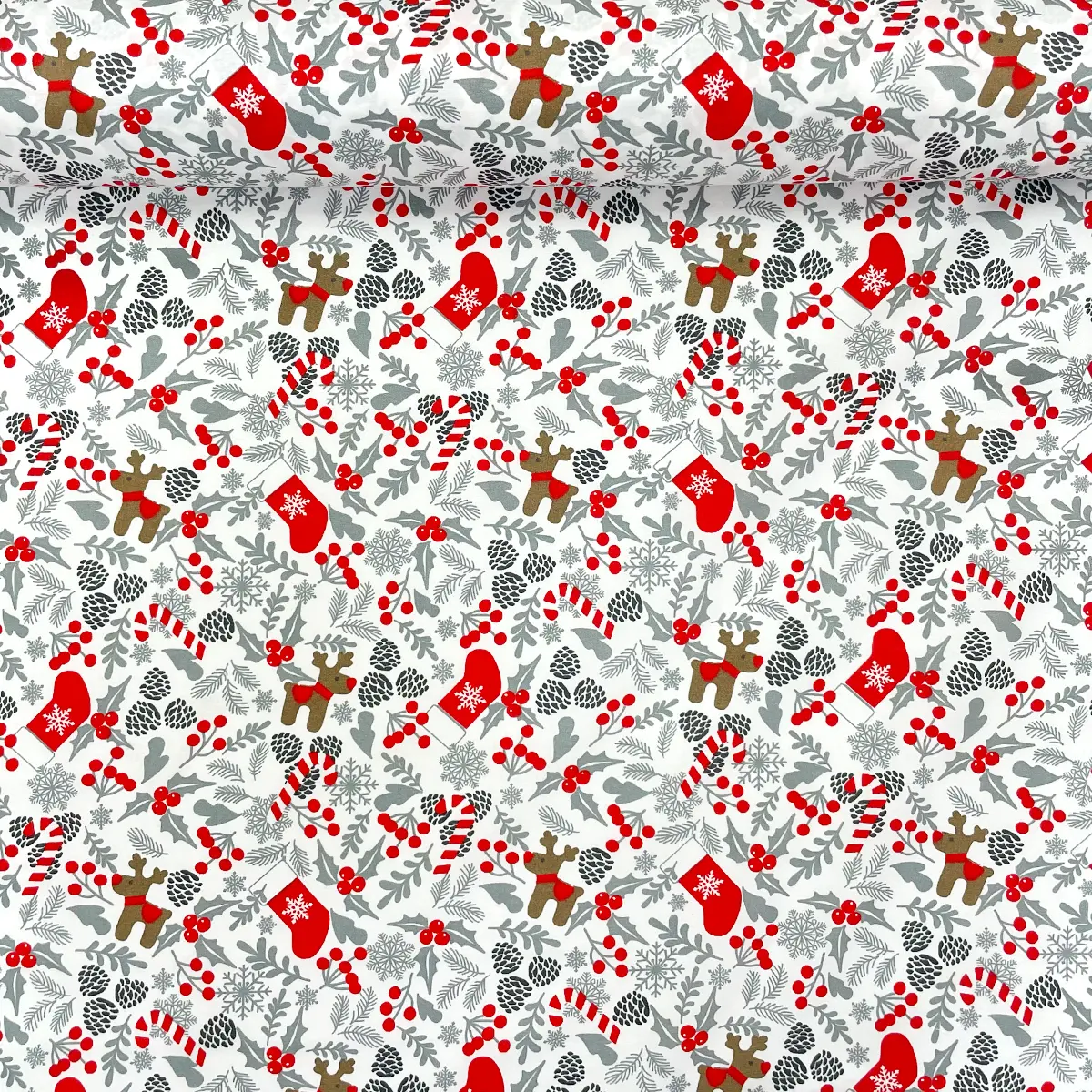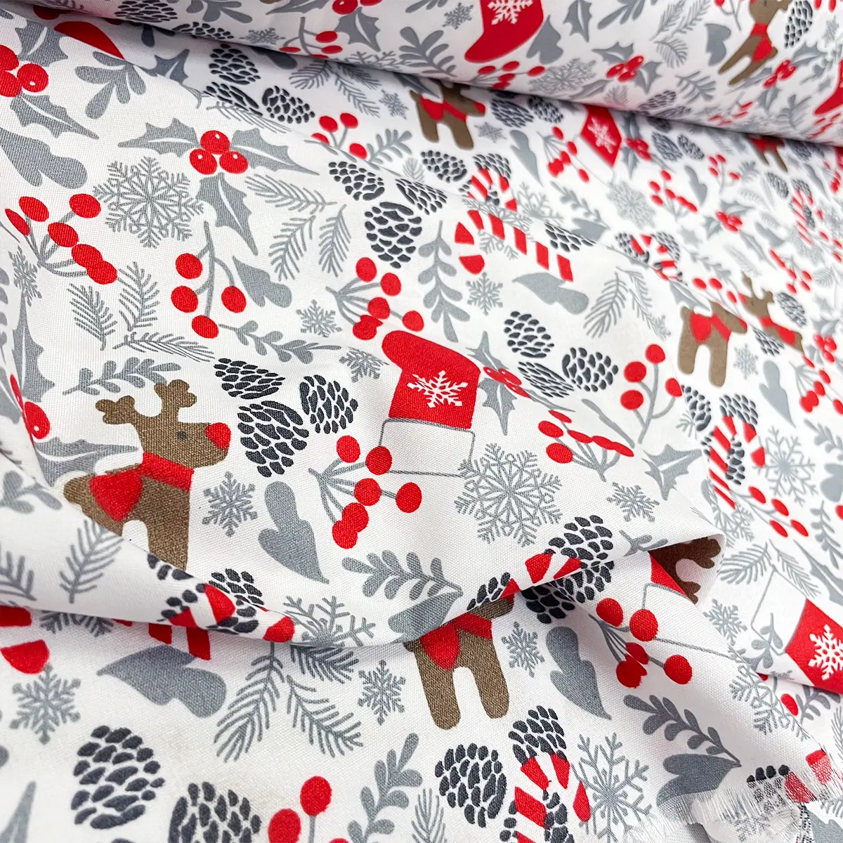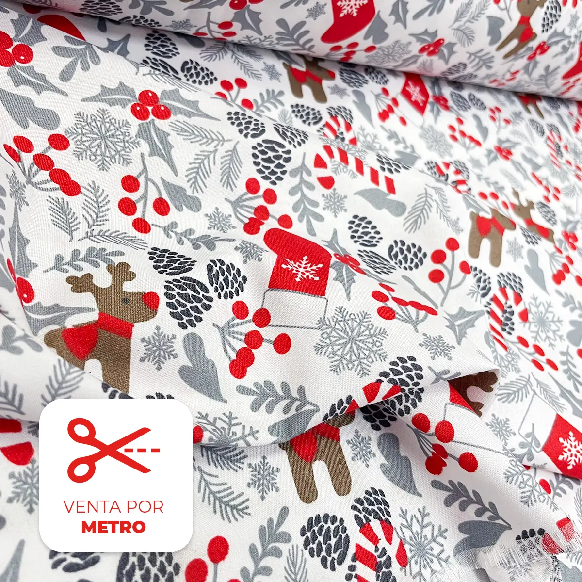 La Tela Algodón Candy Navideño «Navidad Blanca» 120 cm ancho, Perfecto para la Creación de Cortinas y Decoración del Hogar – Precio Por Metro es la tela ideal para una Navidad sofisticada. Su composición Algodón Candy 100 % poliéster le da la suavidad y caída perfectas para la Creación de Cortinas y otros elementos de Decoración del Hogar. Adquiere esta tela por Precio Por Metro para vestir tus espacios con la pureza y la elegancia del invierno.