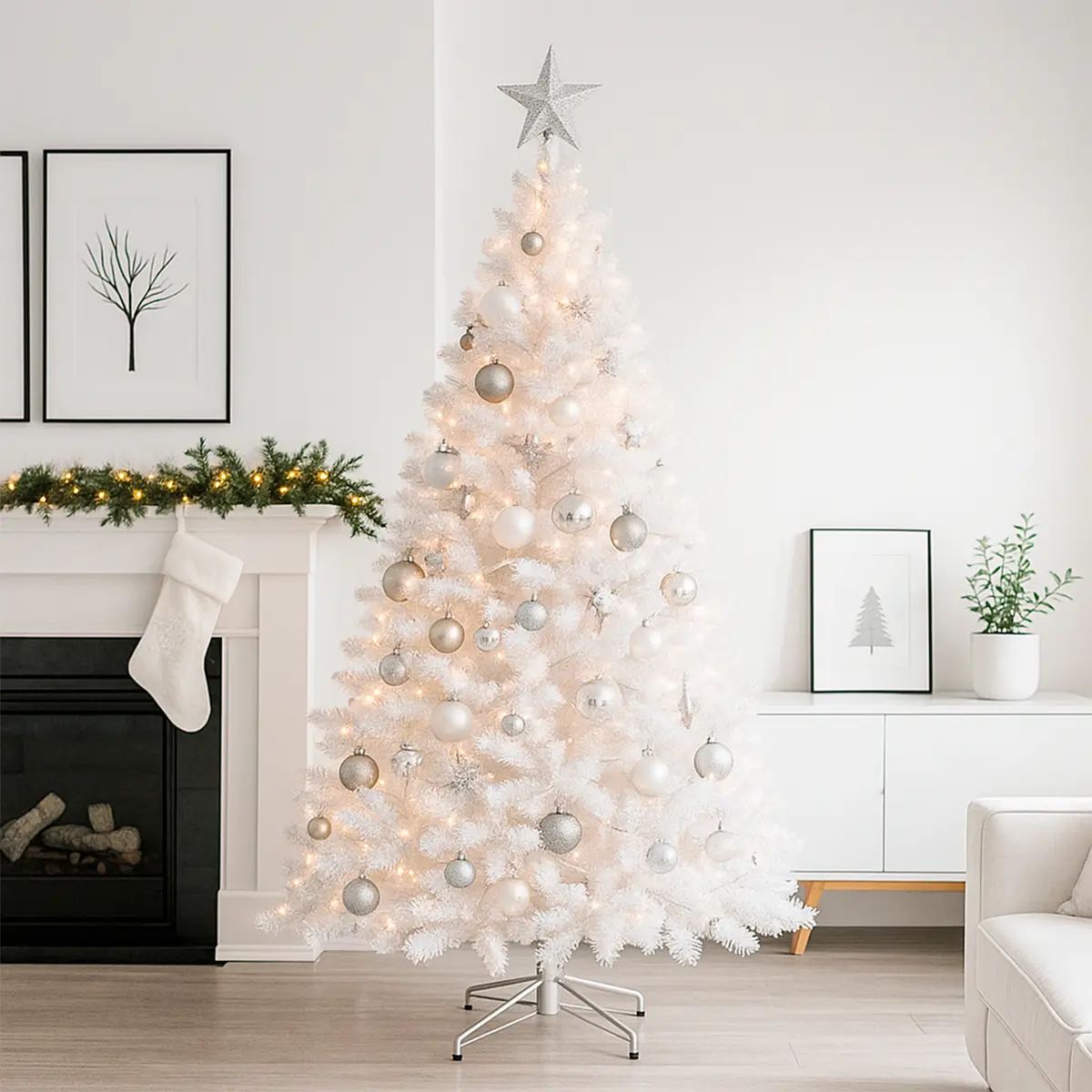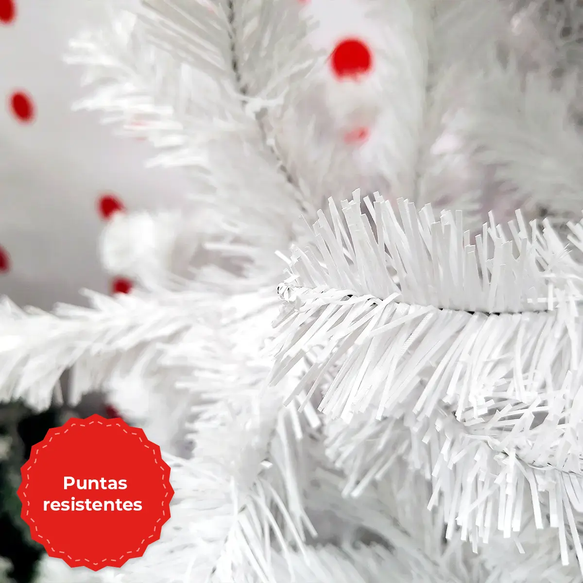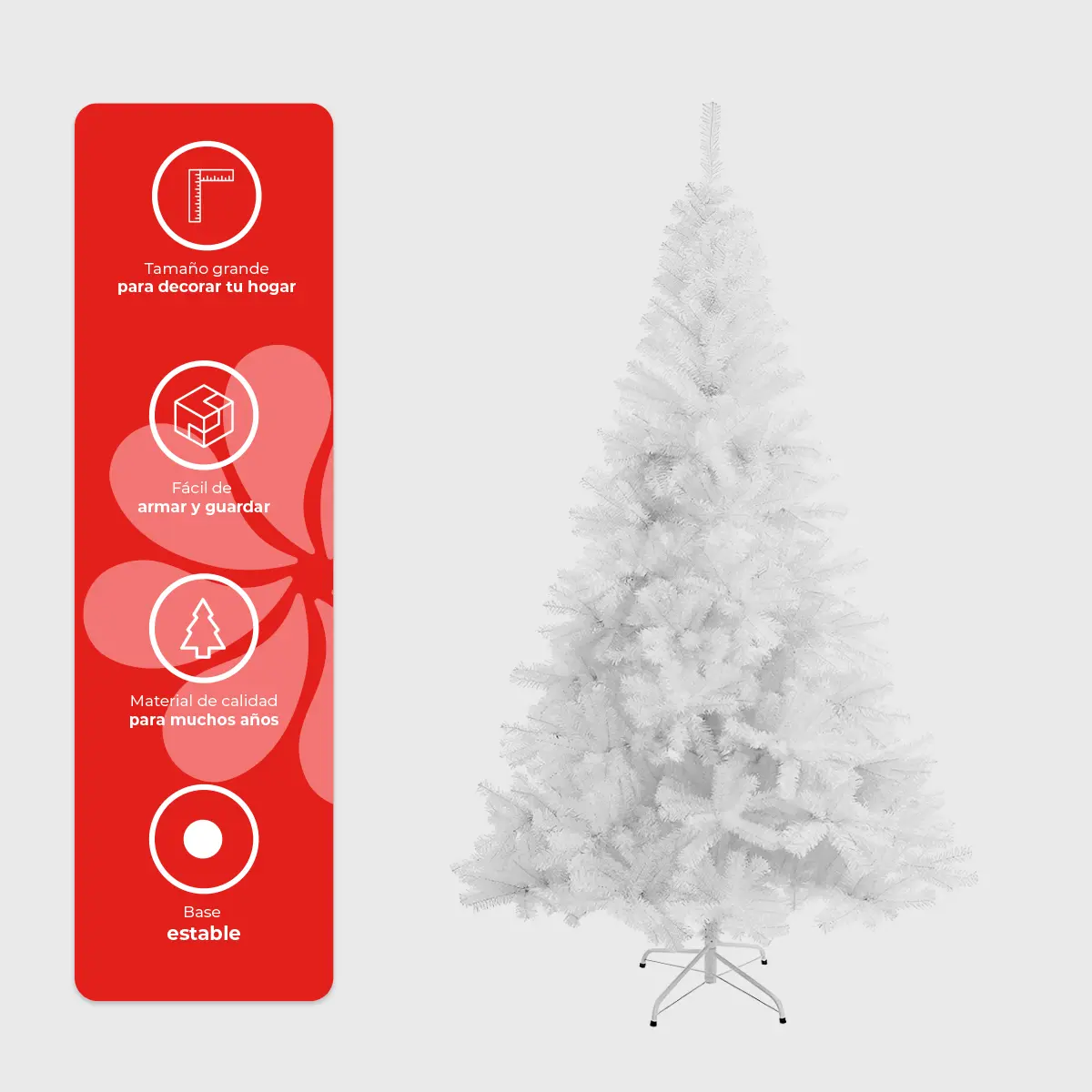 Su tonalidad blanca aporta un estilo sofisticado que combina con cualquier tipo de decoración: dorada, plateada, roja o multicolor. Fabricado con ramas frondosas de PVC de alta densidad, este árbol ofrece una apariencia abundante y realista que imita la suavidad de la nieve invernal.