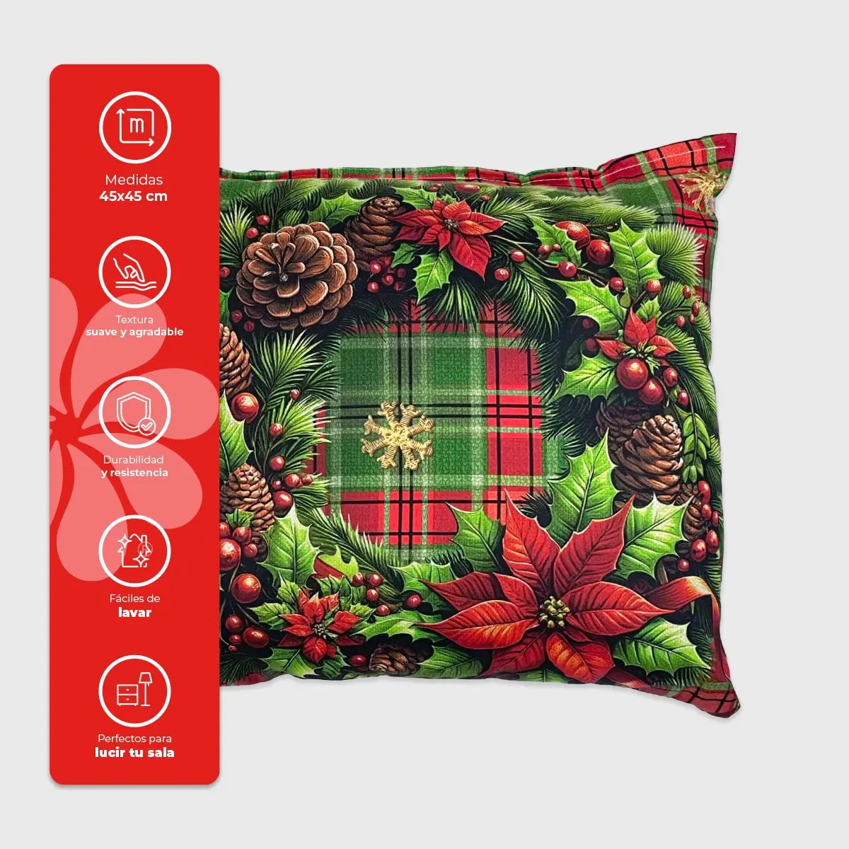 Decora tu hogar con el Paquete de 2 Cojines Navideños “Corona de Esperanzas”, confeccionados en 100 % poliéster con un diseño clásico de nochebuenas, piñas y hojas invernales. Suaves, resistentes y perfectos para llenar tu sala de espíritu navideño.