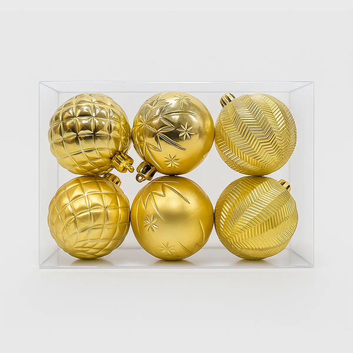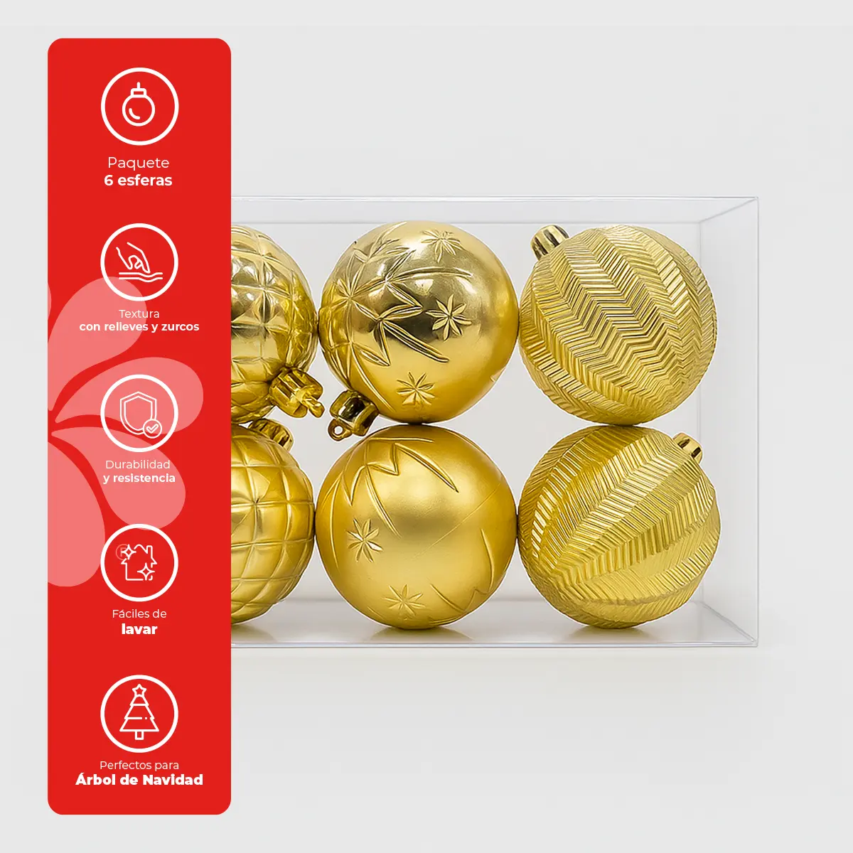 Cada set incluye 6 esferas de distintos diseños: 3 con acabado brillante que reflejan la luz con un resplandor festivo, y 3 con acabado mate que equilibran la composición visual con un toque de sutileza.