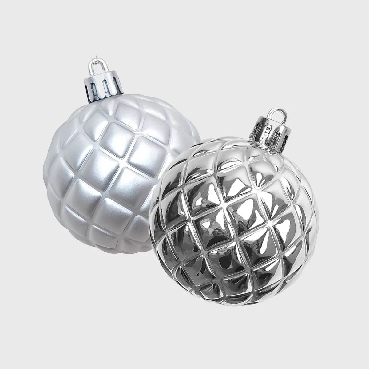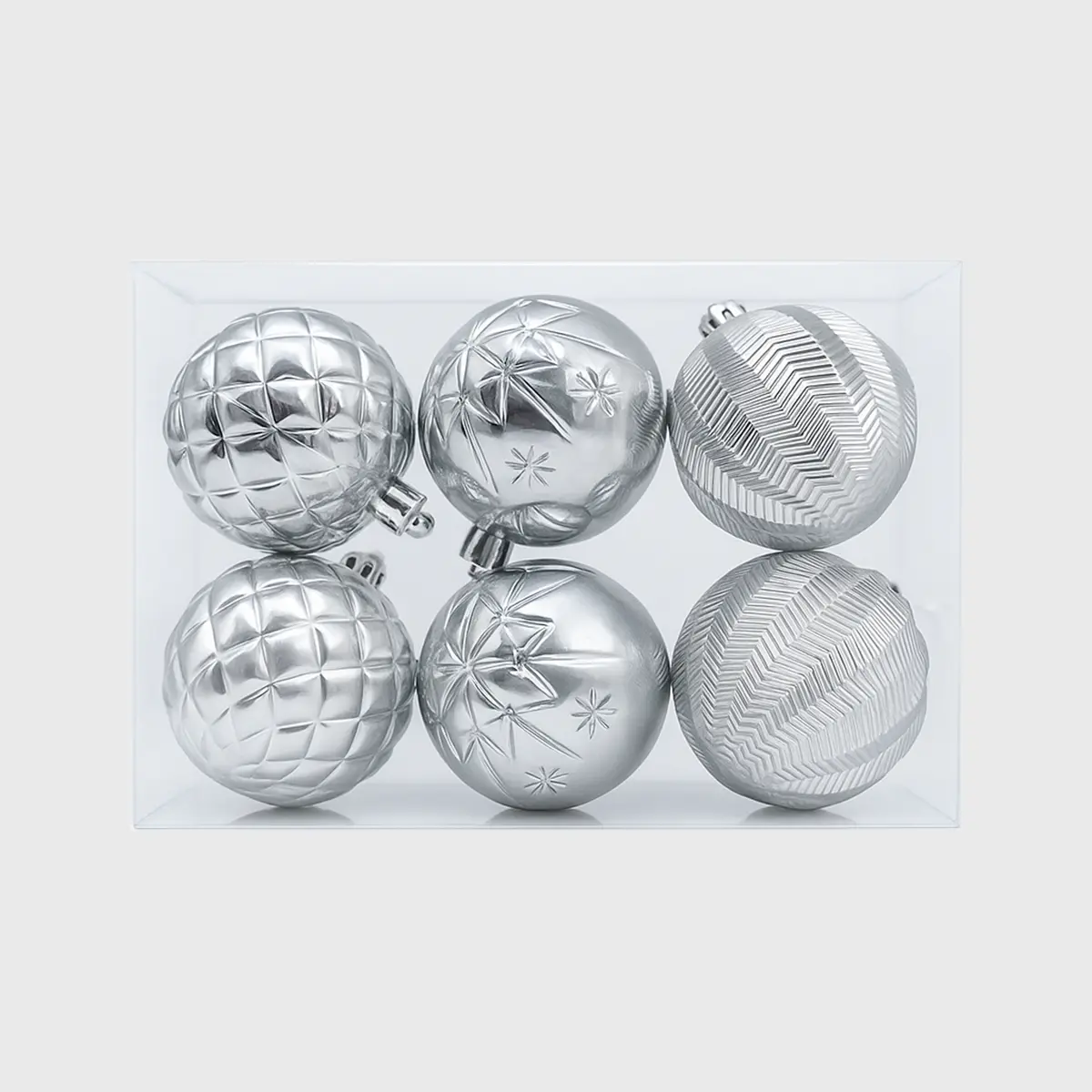 Crea una decoración elegante y moderna con el Paquete de 6 Esferas Navideñas Plateadas de Plástico, con diseños surtidos en acabado mate y brillante. Resistentes, ligeras y seguras, ideales para decorar tu árbol o espacios festivos.