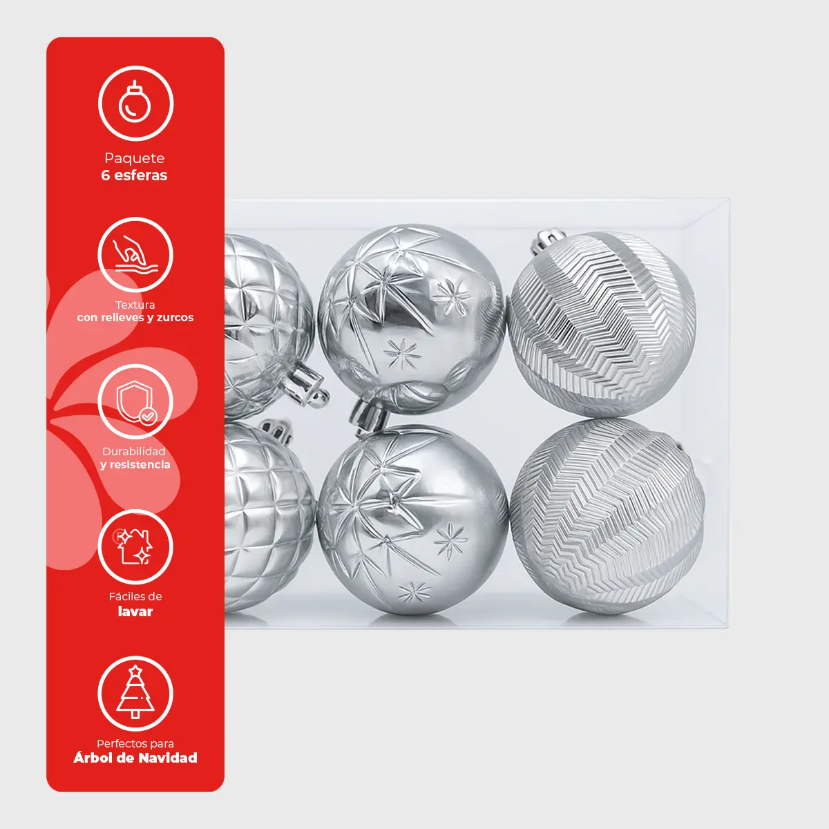 Cada paquete incluye 6 esferas con diseños surtidos, combinando 3 con acabado brillante para reflejar la luz y 3 con acabado mate que añaden profundidad visual. Su variedad de texturas permite crear un contraste perfecto y equilibrado en cualquier árbol.