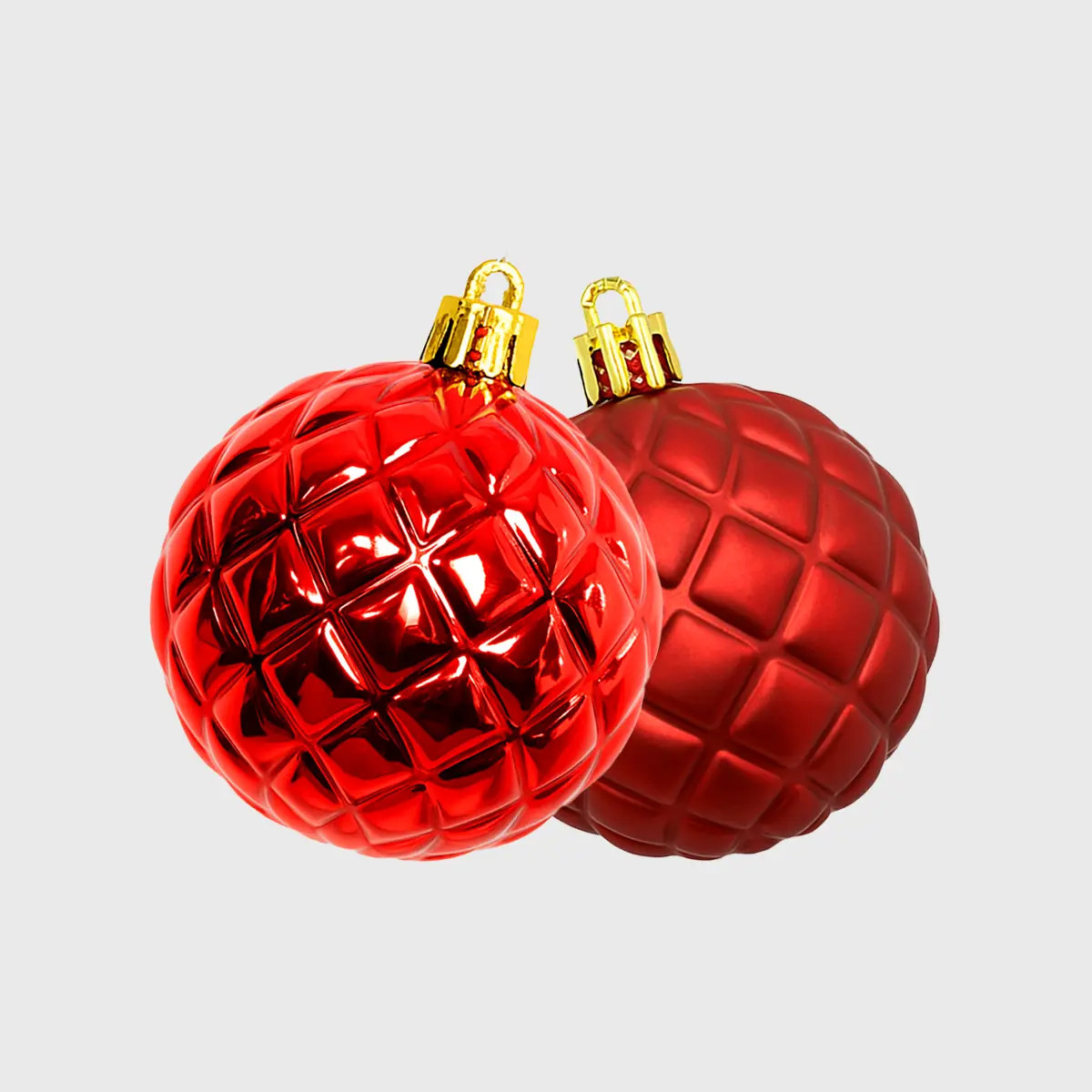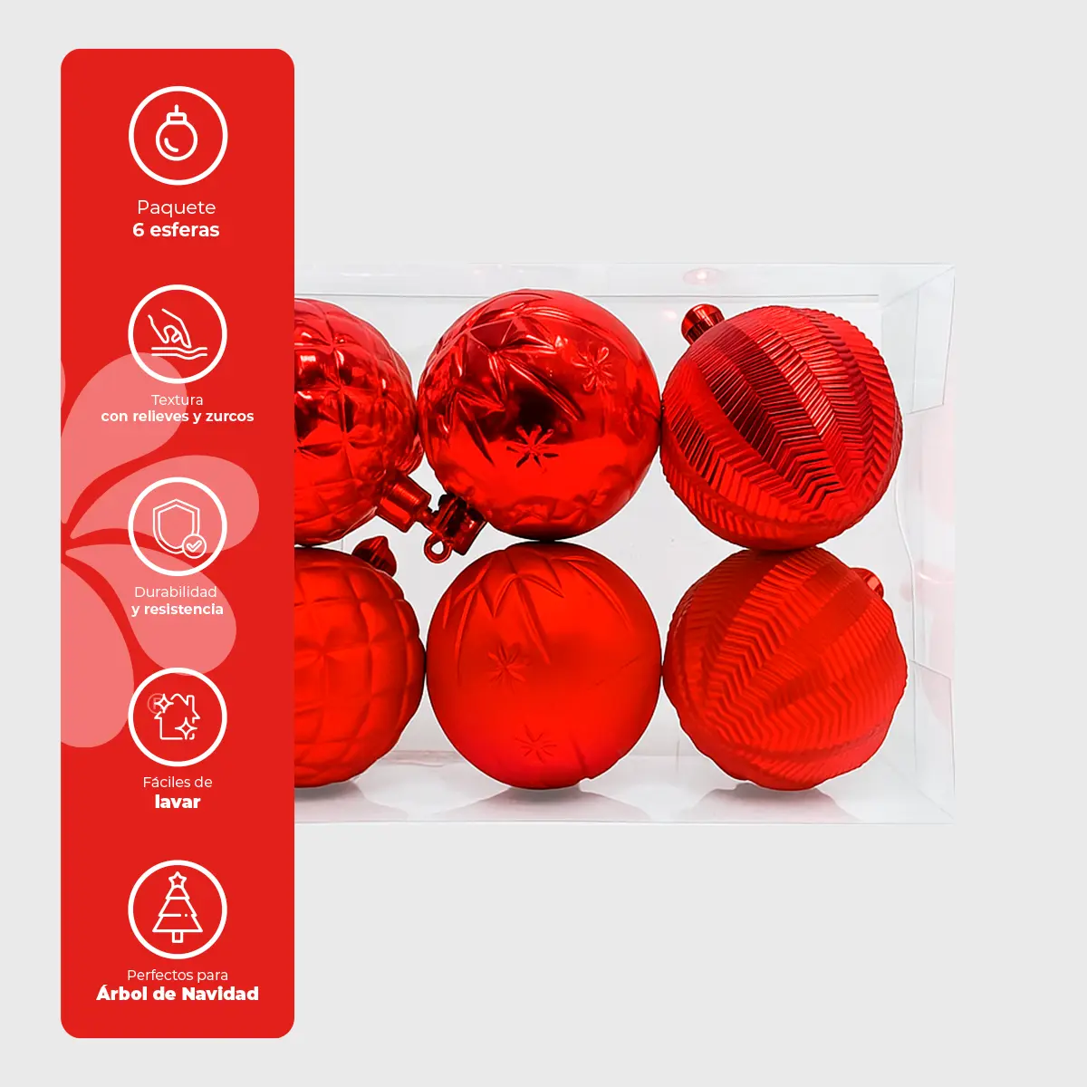 Cada set incluye 6 esferas de diseños surtidos, combinando 3 brillosas y 3 mate, para lograr un contraste elegante y armonioso en tu decoración. Los acabados en relieve añaden textura y luminosidad, haciendo que cada esfera destaque por sí misma.