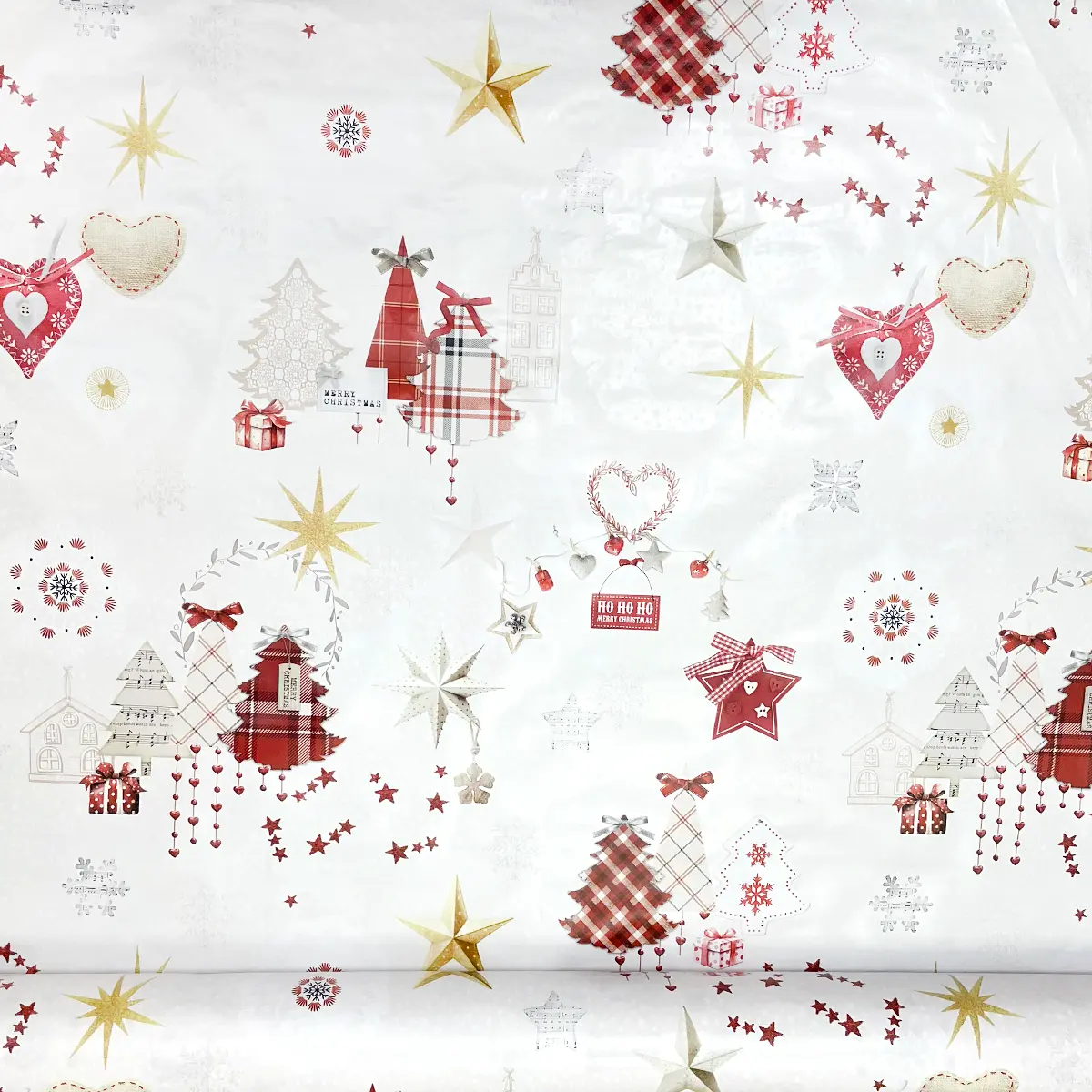 El formato de Rollo de 25 m del Mantel Navideño Blanca Navidad y su ancho de 137 cm son la opción ideal para la decoración de hogares amplios, salones de eventos o negocios que buscan una estética impecable y uniforme. El rollo asegura que tendrás suficiente material para cubrir diversas mesas o para usarlo en proyectos decorativos a gran escala. Su composición de plástico no PVC es una característica de valor, ofreciendo una barrera 100% impermeable, a prueba de líquidos y manchas. Disfruta de la elegancia sin la preocupación de la lavandería; este Mantel Navideño Blanca Navidad se limpia al instante con un simple paño.