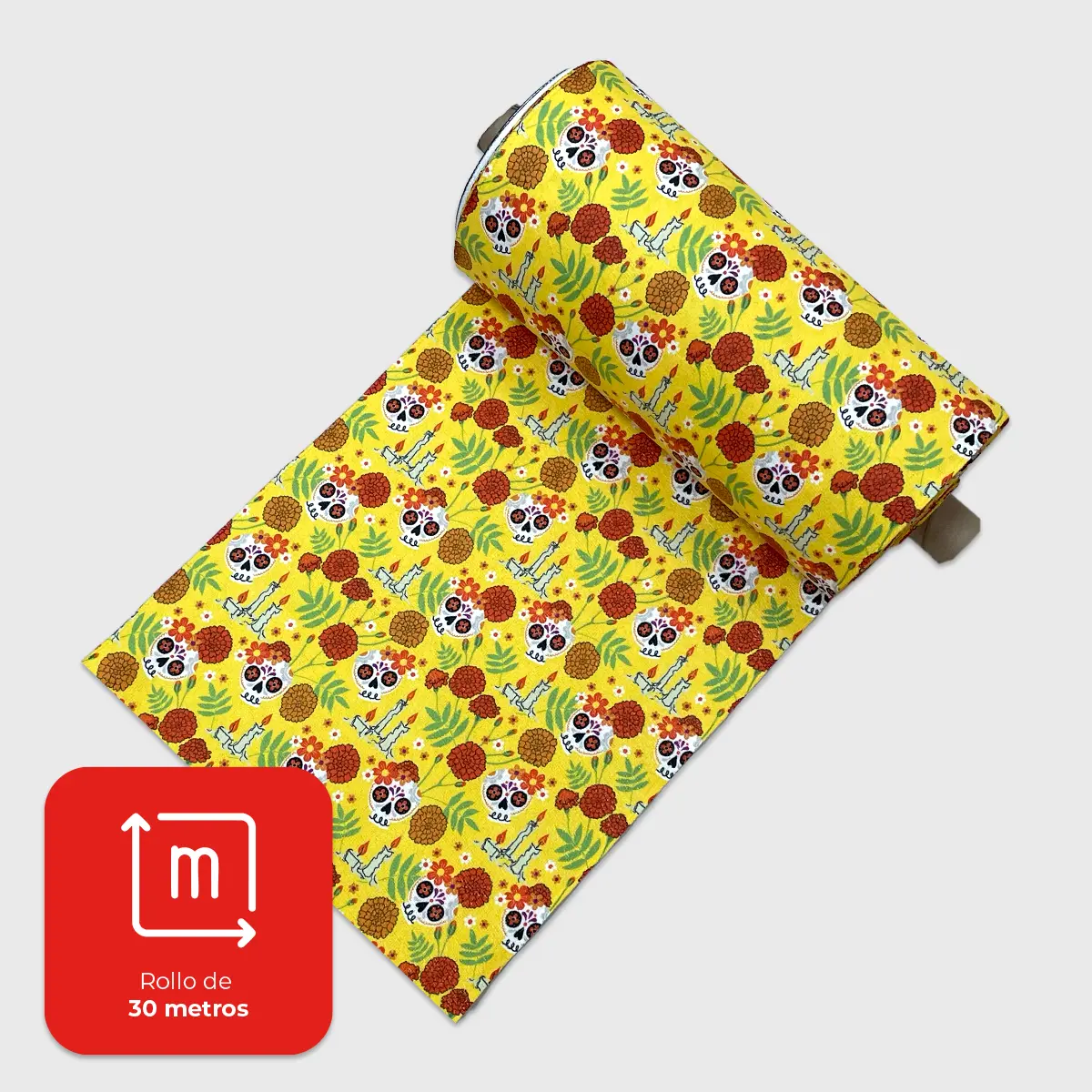 En cuanto a las manualidades, su diseño de calaveras sonrientes lo convierte en una opción fantástica para proyectos de temporada. Puedes cortar formas para decorar ofrendas de Día de Muertos, crear manteles individuales temáticos para tu mesa de Halloween, o incluso diseñar pequeños parches y detalles para disfraces. Es fácil de cortar, pegar y coser, lo que lo hace accesible tanto para principiantes como para artesanos experimentados. Úsalo también como fondo decorativo o para forrar cajas y cestas.
