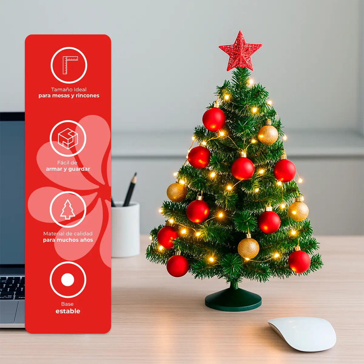 Con su tamaño compacto y estructura estable, es ideal para colocar en mesas, escritorios, repisas o recibidores, llenando de alegría y color cualquier espacio. Fabricado con materiales de calidad, este árbol garantiza una apariencia frondosa, duradera y fácil de mantener año con año.