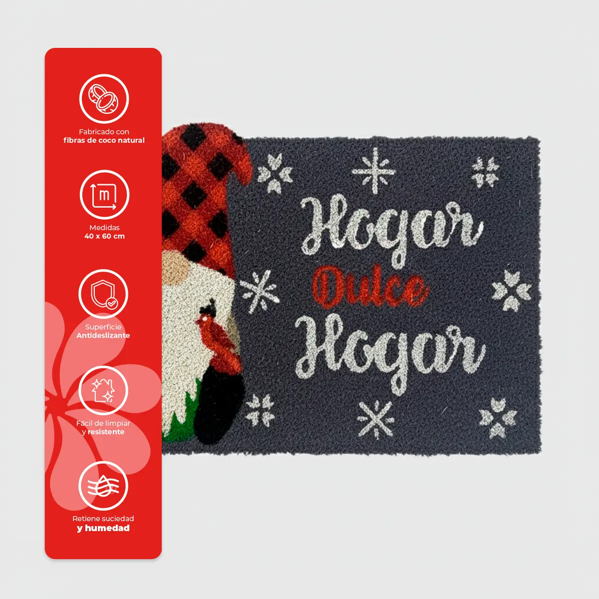 Llena tu hogar de encanto y calidez esta temporada con el Tapete Navideño de Fibra de Coco “Hogar Dulce Hogar”, una pieza que combina funcionalidad y estilo festivo. Su tierno diseño con un gnomo navideño y la frase “Hogar Dulce Hogar” evoca el espíritu de unión y alegría que caracteriza a la Navidad.