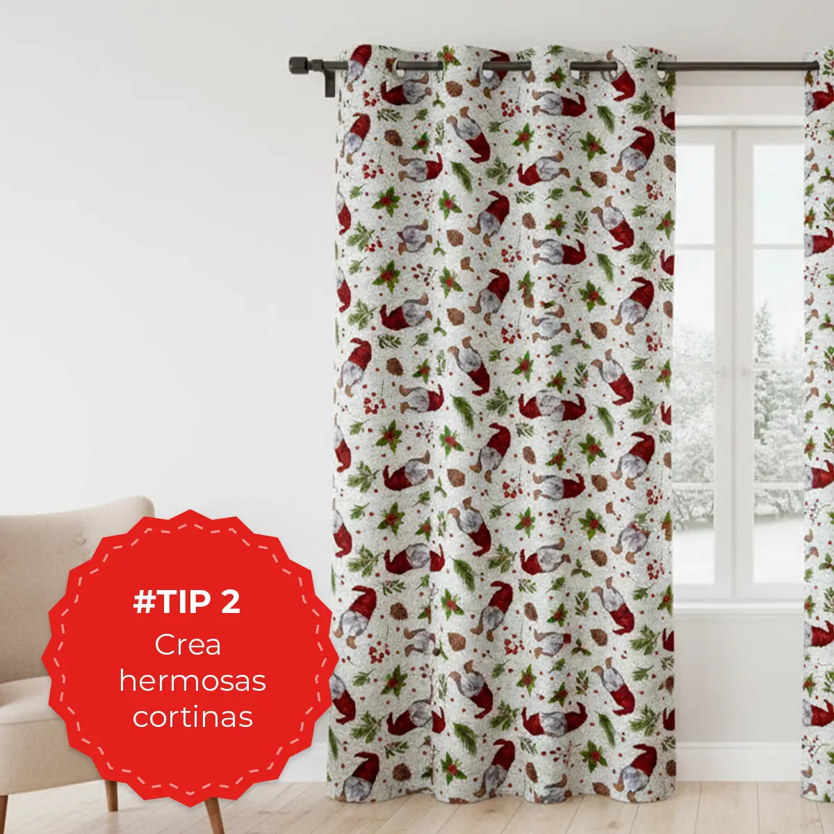 Transforma tu hogar para las fiestas con la encantadora Tela Loneta Navideña «Gnomos de la Nochebuena» de 140 cm de ancho. Es el lienzo perfecto para crear cortinas, manteles y cojines que irradien alegría. Su diseño de gnomos festivos añade un toque mágico y juguetón a cualquier espacio.
