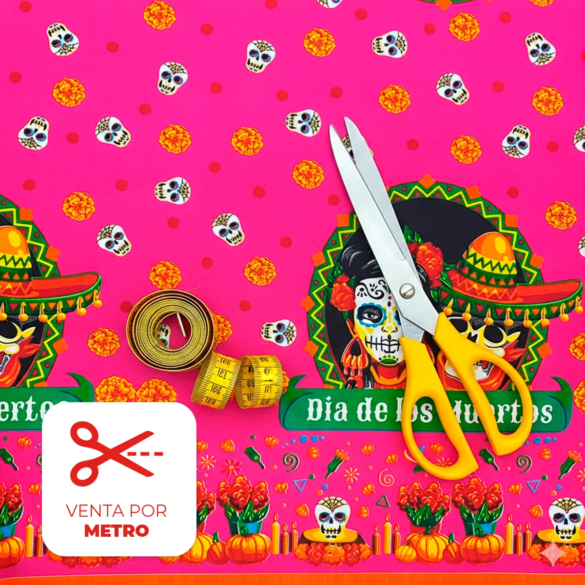 La Tela Minimatt «Jolgorio de Calaveras» se vende por metro, ideal para comprar la cantidad exacta que necesites en tus proyectos de Día de Muertos. Con un ancho de 150 cm, resulta perfecta para confeccionar manteles, cortinas, caminos de mesa, disfraces y manualidades.