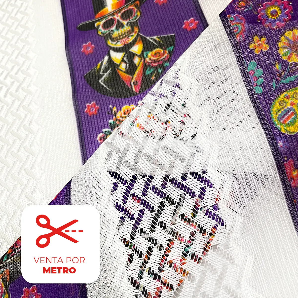 Da un toque distinguido a tus decoraciones con la Tela Sevillana “Danza de Catrines”. Su diseño con catrines elegantes, flores y tonos morados es ideal para mesas, altares y manualidades del Día de Muertos. Se vende por metro.